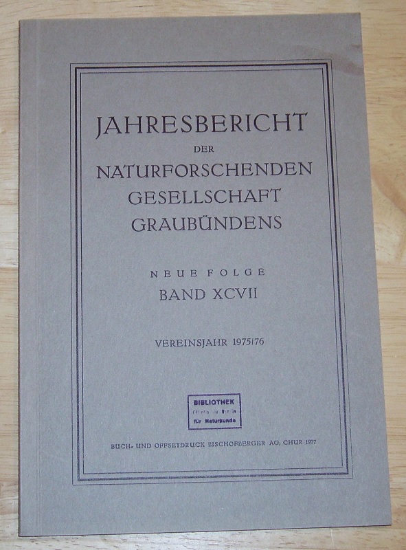 Naturforschende Gesellschaft Graubünden [Verfasser]: Jahresbericht der Naturforschenden Gesellschaft Graubündens Neue Folge Band XCVII. Chur: Bischofberger 1977 22,5 cm, 110 S. mit Ill. Kart. Ecken bestoßen / geknickt, kl. Stempel a. Umschlag. Sonst gut erhalten. Aus der aufgelösten Bibliothek des Offenbacher Vereins für Naturkunde.