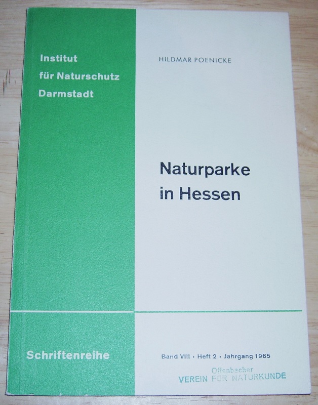Poenicke, Hildmar: Naturparke in Hessen. Darmstadt: Institut f. Naturschutz, 1965. 8. 66 S. mit Abb. u. Ktn., 1 Titelbild. Kart. Leichte Gebrauchsspuren. Stempel a. Umschlag + Titel. Oberer Schnitt gering braunfleckig. Schriftenreihe / Institut für Naturschutz, Darmstadt, Bd. 8, H. 2. Aus der aufgelösten Bibliothek des Offenbacher Vereins für Naturkunde.