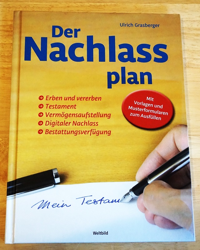 Grasberger, Ulrich: Der Nachlassplan. Erben und Vererben : Testament, Vollmachten, Vermögensübersicht, digitaler Nachlass : mit Mustervorlagen und Vorlagen für Erblasser und Erben. Augsburg: Weltbild, 2018. 29 cm. 157, 3 Seiten Illustrationen. Ppd. Leichte Gebrauchsspuren. Keine Eintragungen.