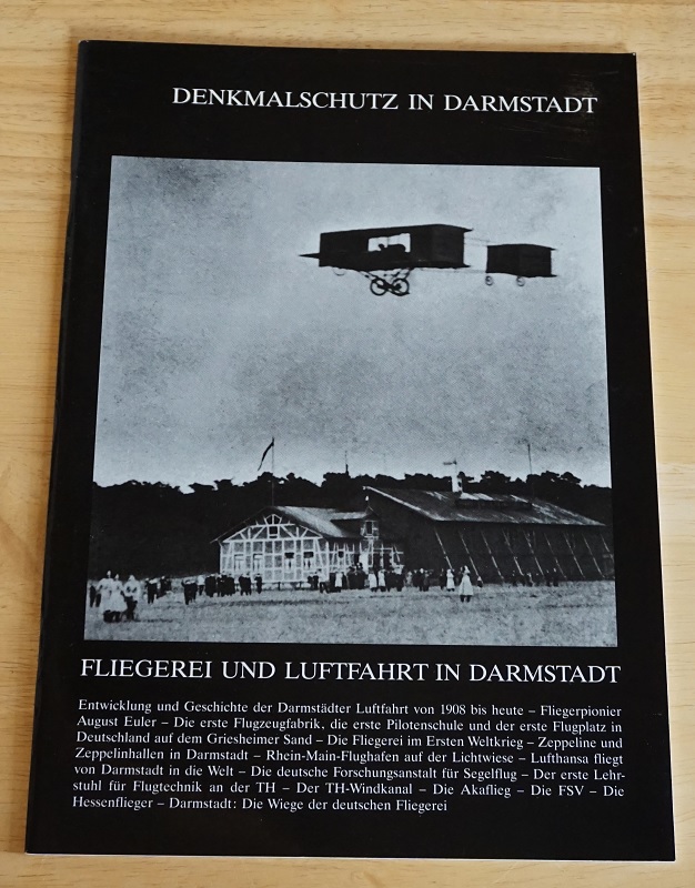 Reinhold-Postina, Eva: Fliegerei und Luftfahrt in Darmstadt. Darmstadt: Magistrat der Stadt Darmstadt – Denkmalschutz – Kulturamt, 1994. 30 cm. 44 Seiten Illustrationen. Geheftet. Leichte Gebrauchsspuren. Denkmalschutz in Darmstadt Heft 3.