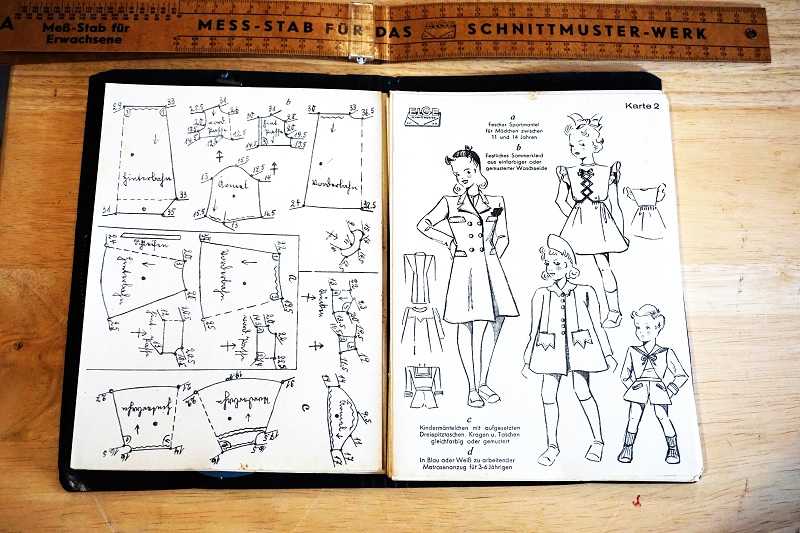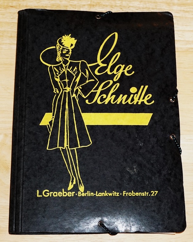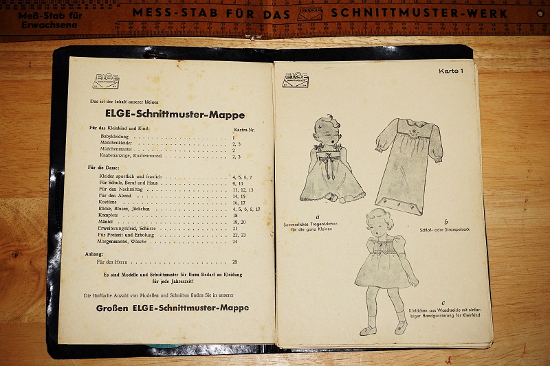 Kleine Elge-Schnittmuster-Mappe. Komplett. Berlin-Lankwitz: L. Graeber (vor 1945) 23 cm, 33 Karten lose in Gummizug-Mappe. Beiliegend: Meß-Stab für das Elge Schnittmuster-Werk für Erwachsene / Kinder (1 x gefaltet). Original-Mappe. Deutliche Gebrauchsspuren. Mappe + Karten an den Ecken / Kanten bestoßen. Karten braunfleckig, handschriftl. Notiz auf der Gebrauchsanweisung.