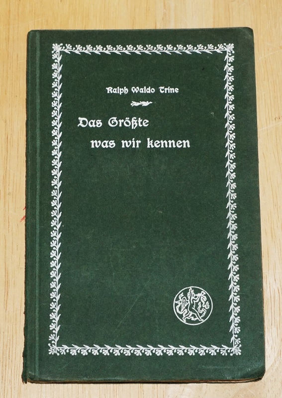Trine, Ralph Waldo: Das Größte was wir kennen. 21. – 25. Tsd. Stuttgart: Engelhorn, 1910. 17 cm, 80 S., Kopfgoldschnitt, altdeutsche Schrift. Ppd. Ecken / Kapital bestoßen, seitlicher Schnitt unbeschnitten. Papier gebräunt.