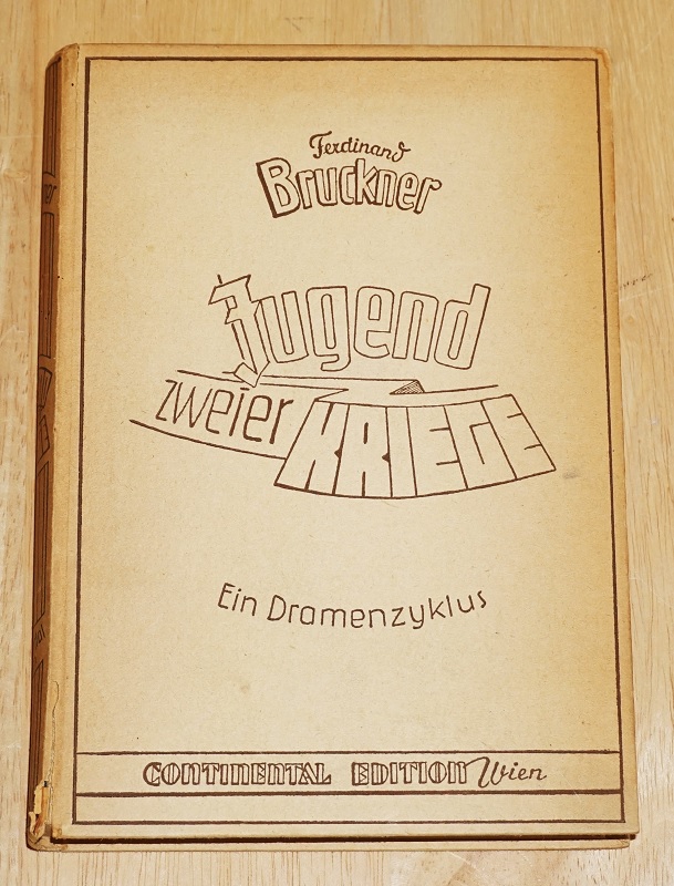 Bruckner, Ferdinand: Jugend zweier Kriege. Ein Dramenzyklus. Wien: Continental Ed. Sexl, 1947. 8°. 256 S. Ppd. Deutliche Gebrauchsspuren. Einband am Rücken ein Stück aufgeplatzt. Einband u. Papier gebräunt, Adressstempel a. T. Bruckner, Ferdinand: Dramatische Werke.