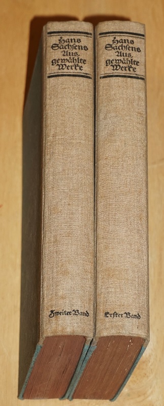 Sachs, Hans: Hans Sachsens ausgewählte Werke Band 1 + 2.. Bd. 1: Gedichte. Bd. 2: Dramen. 2 Bände. Leipzig: Insel-Verl., 1911. 22,5 cm, XII, 322 / 351 S. Ill., Notenbeisp. Altdeutsche Schrift. HLn. Einband etw. gebräunt / fleckig, Einbandecken bestoßen. Sonst gut erhalten.