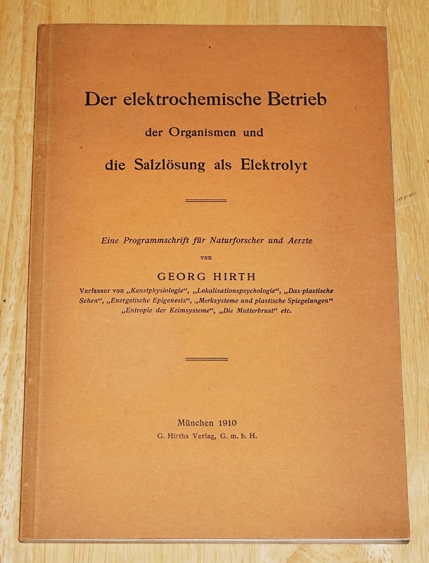 Hirth, Georg: Der elektrochemische Betrieb der Organismen und die Salzlösung als Elektrolyt. Eine Programmschrift für Naturforscher und Aerzte. München: Hirth, 1910. 8°. 84 S. Kart. Gut erhalten. Umschlag u. Schnitt gebräunt, Umschlagkante hinten mit kl. Einriß. Zur Lehre vom elektromagnetischen Betrieb der Organismen / Georg Hirth, 1.