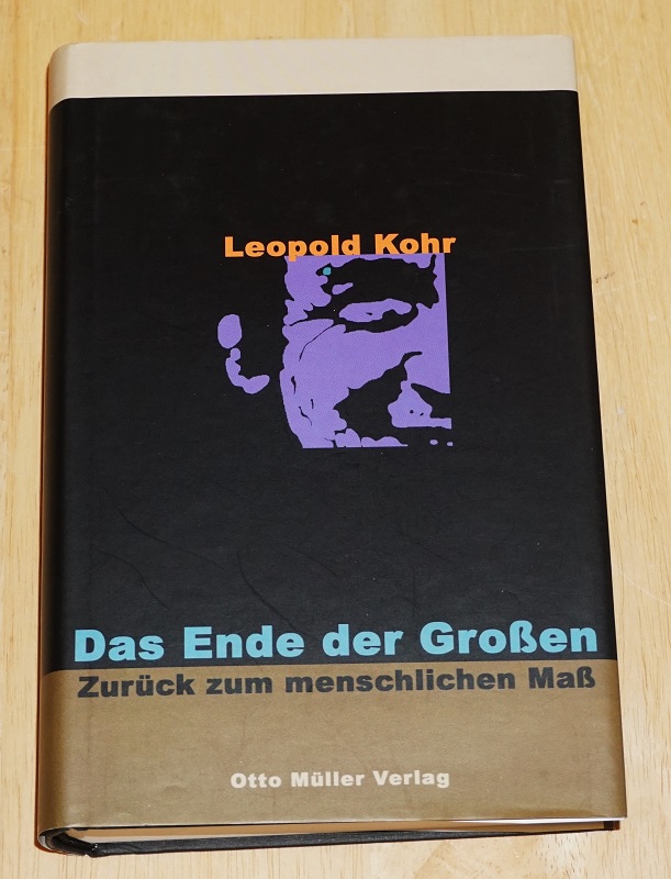 Kohr, Leopold: Das Ende der Großen. Zurück zum menschlichen Maß. Salzburg/Wien: Müller, 2002. 21 cm. 343 S. Kt. Ppd., SU. Leichte Gebrauchsspuren. Priv. Handschriftliche widmung im Vorsatz. Werkausgabe.
