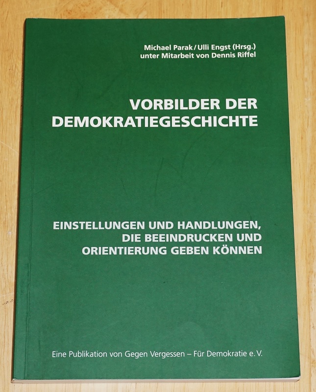 Parak, Michael (Hrsg.): Vorbilder der Demokratiegeschichte. Einstellungen und Handlungen, die beeindrucken und Orientierung geben können. 1. Auflage. Berlin: Gegen Vergessen – Für Demokratie e.V., 2022. 21 cm. 111 Seiten. Kart. Leichte Gebrauchsspuren.