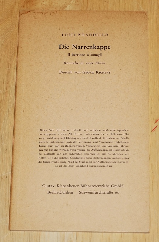 Pirandello, Luigi: Die Narrenkappe. Il berretto a sonagli. Komödie in zwei Akten. Deutsch von Georg Richert. als Ms. gedr. Berlin: Kiepenheuer Bühnenvertrieb, o.J. 19 cm, S. 88 – 132. Kart. Umschlag am oberen Rand etw. fleckig, sonst leichte Gebrauchsspuren. Innen sauber.
