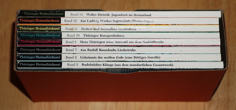 Thüringer Heimatbücherei. Konvolut von 8 Bänden im Schuber. Enthält: Band 3: Anton Sommer: Rudolstädter Klänge. Aus dem mundartlichen Gesamtwerk ausgewählt von Julius Kober / Band 5: Margot Boger-Langhammer: Geheimnis der weißen Erde. Eine Böttiger-Novelle. / Band 7: Aus Rudolf Baumbachs Liedertruhe. Ausgewählt und zusammengestellt von Julius Kober / Band 8: Paul Wolf: Mein Thüringen. Aus dem Nachlaß ausgewählt von Jochem Nietzold. / Band 10: Gustav Schröer: Thüringer Kurzgeschichten. Aus dem Nachlaß ausgewählt von Gertrud Schröer. / Band 11: Paul Quensel: Heitere und besinnliche Geschichten. Ausgewählt von W.O. Paul Kettel. / Band 12: Aus Ludwig Wuckes Sagenschatz. Ausgewählt und zusammengestellt von Jochem Nietzold. / Band 14: Walter Dietrich: Jugendzeit im Heimatland. Erinnerungen und Erzählungen aus Nordthüringen. 8 Bände. Würzburg: Thüringer Tageszeitung / Dr. Ludwig Nonnes Erben 1960 – 1963 17 cm, je 63 – 71 S. Kart. im Schuber. Leichte Gebrauchsspuren. Schnitt z.T. etw. gebräunt, am Rücken vereinzelt gering braunfleckig.