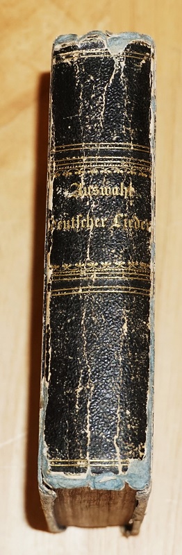 Auswahl deutscher Lieder. Mit ein- und mehrstimmigen Weisen. 7., stark verm. und gänzlich umgearb. Aufl. Leipzig: Serig, 1850. 13 cm, 648 S. zahlr. Noten. Ppd. Einband mit deutlichen Gebrauchsspuren. Rücken an den Kapitalen bestoßen / etw. beschädigt, Einbandecken bestoßen. Schnitt gebräunt / braunfleckig, z.t. auch innen. Bindung fest. Leeres Vorsatzblatt mit Einriß, einzelne Seitenecken mit Knickspur (Eselsohr).