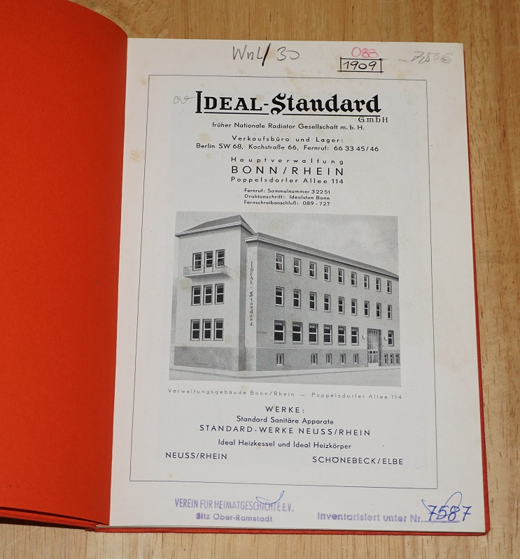 Ideal-Standard GmbH.: Standard Kristallporzellan. [Verkaufskatalog Sanitärkaramik + Badezimmer-Zubehör]. Bonn / Rhein: 1951 21 cm, 85 S. mit Abb. + Maßzeichnungen. Ln. Ehemaliges Bibliotheks-Exemplar mit entsprechenden Kennzeichen. Leeres Vorsatzblatt mit Knickspur, Titelblatt braunfleckig. Sonst innen sauber und gut erhalten.
