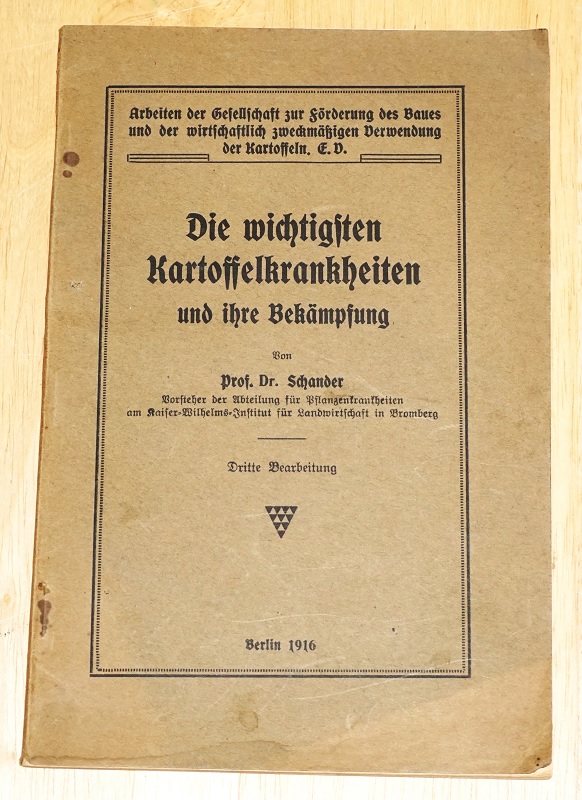 Schander, Prof. Dr.: Die wichtigsten Kartoffelkrankheiten und ihre Bekämpfung. Dritte Bearbeitung. Berlin: 1916 21 cm, 95 S. mit 23 Abb. Kart. Umschlag lichtrandig, fleckig, Ecken bestoßen. Klammern gerostet. Schnitt gebräunt. Innen sauber. Arbeiten der Gesellschaft zur Förderung des Baues und der wirtschaftlichzweckmäßigen Verwendung der Kartoffeln e.V. Heft 4.