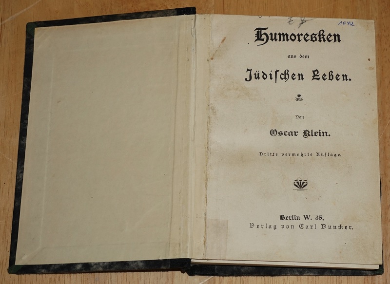 Klein, Oskar: Humoresken aus dem Jüdischen Leben. 3. verm. Aufl. Berlin: C. Duncker, 1904. 16 cm, (264 S.) HLn. Starke Gebrauchsspuren. Kapitale u. Einbandecken bestioßen, Block mehrfach gebrochen.