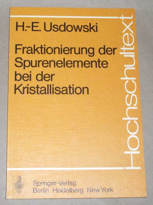 Usdowski, Hans-Eberhard: Fraktionierung der Spurenelemente bei der Kristallisation. Berlin, Heidelberg, New York: Springer, 1975. 25 cm. VIII, 104 S., 42 graph. Darst. Kart. Unterer Schnitt etw. angeschmutzt. Sonst leichte Gebrauchsspuren. Hochschultext. Literaturverz. S. 101 – 102.