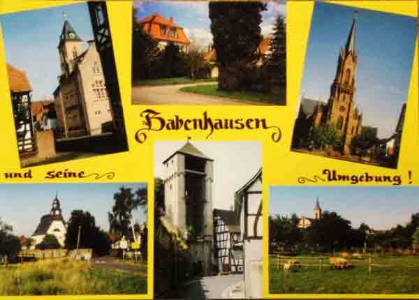 Babenhausen und seine Umgebung. Harpertshausen: Kombinationsbau Rathaus / Kirche (1867). Harreshausen: ehem. gräfliches Jagdschloß (1723). Langstadt: evangelische Pfarrkirche (1880). Babenhausen: Stadtmauer, Hexenturm und Fachwerkhaus (15. Jh.). Sickenhofen: evangelische Kirche (1831). Photos: Frank Ludwig Diehl. Langstadt: Postkartenverlag Diehl 15 x 10,5 cm, Neuware