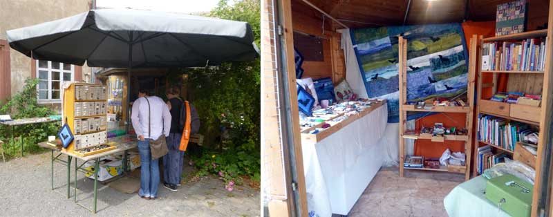 Mit neuen Kisten für Knöpfe in Schachteln, die übereinandergestellt ein Regal ergeben (vgl. Bild links), hat sich die Fernwirkung unseres Knopfangebotes auf dem Handarbeitsmarkt deutlich verbessert. Aber auch das sonstige Kurzwaren- und Handarbeitsbücherangebot präsentiert sich dank zunehmend einheitlicher Holzkisten und der Regale auf dem alljährlichen Handarbeitsmarkt auf der Veste Otzberg recht gefällig (Bild rechts. Alle Bilder: Dirk Diehl). |