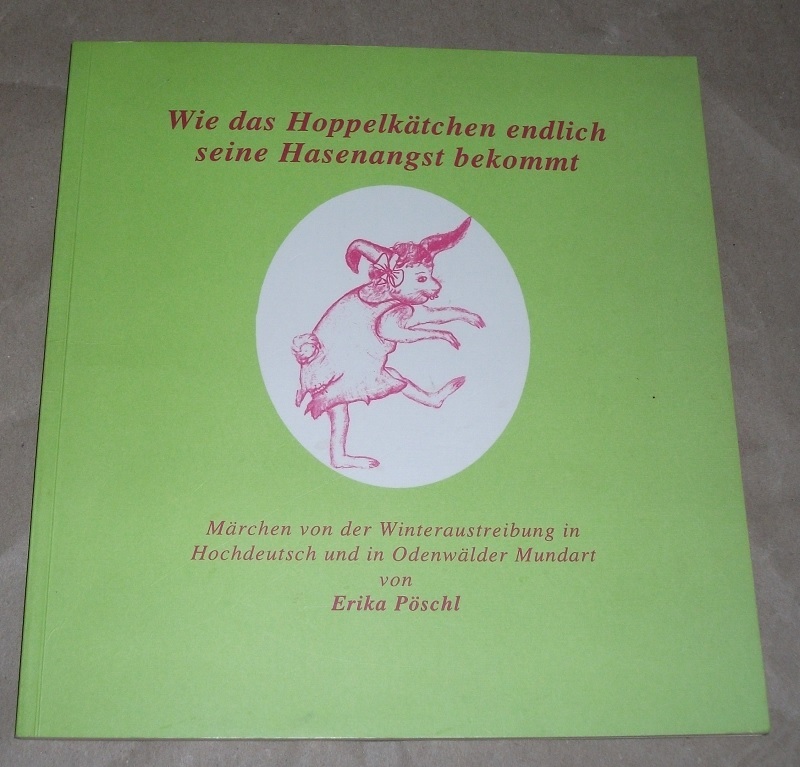 Pöschl, Erika: Wie das Hoppelkätchen endlich seine Hasenangst bekommt. Märchen von der Winteraustreibung in Hochdeutsch und in Odenwälder Mundart. Ober-Ramstadt-Rohrbach: Pöschl, 1994. 22 cm. 42 S. Broschur. Umschlag etw. geknickt, sonst leichte Gebrauchsspuren. Mit Widmung der Autorin hinter dem Titelblatt. Signiert.