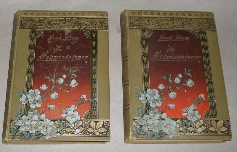 Ebers, Georg: Im Schmiedefeuer. Erster + Zweiter Band. Roman aus dem alten Nürnberg. Erstausgabe. 2 Bände. Stuttgart: Deutsche Verlags- Anstalt 1895 19,5 cm, 304 / 327 S., Ill. Ln. Ecken + Kapitale bestoßen, Einbände etw. berieben, schief gelesen, etw. fleckig, Nr. a. V. + T. EA. WG II 58.