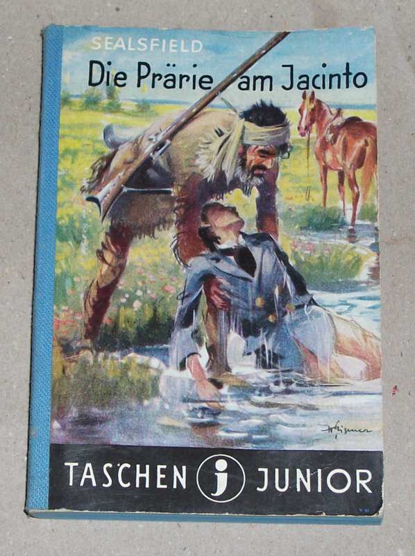 Sealsfield, Charles: Die Prärie am Jacinto. Hamburg: Friedrich Oetinger o.J. 12,5 cm, 189 S. TB mit Leinenrücken. Einband mit Knickspuren u. fleckig, Kanten etw. berieben, Papier gebräunt. Taschenjunior-Bücherei 36