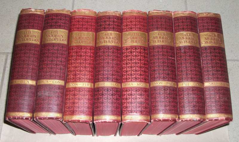 Annandale, Charles (Hrsg.): The Modern Cyclopedia of universal information in 8 Bänden (Komplett). A Handy Book of Reference on all Subjects and for all Readers. With numerous pictoral Illustrations and a series of Maps. 8 Bände. London: Gresham Publishing Company 1902 21,5 cm, je 512 S. mit Ill., Farbschnitt. Ln. Kapitale u. Ecken bestoßen, Einbände u. Vorsätze (braun-) fleckig, Block z.T. angebrochen. Riechen etw. muffig. Bei Band 5 Einbandecke mit Knickspur.