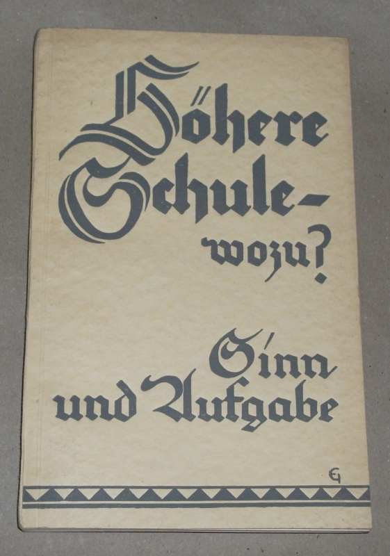 Bohm, Rudolf (Hrsg.): Höhere Schule – wozu? Sinn und Aufgabe. Denkschrift des Deutschen Philologenverbandes. Leipzig: Quelle & Meyer o.J. 22,5 cm, 230 S., altdeutsche Schrift. Kart. Umschlag u. Schnitt gebräunt / angeschmutzt. Ecken etw. bestoßen, Stempel a. Titel.