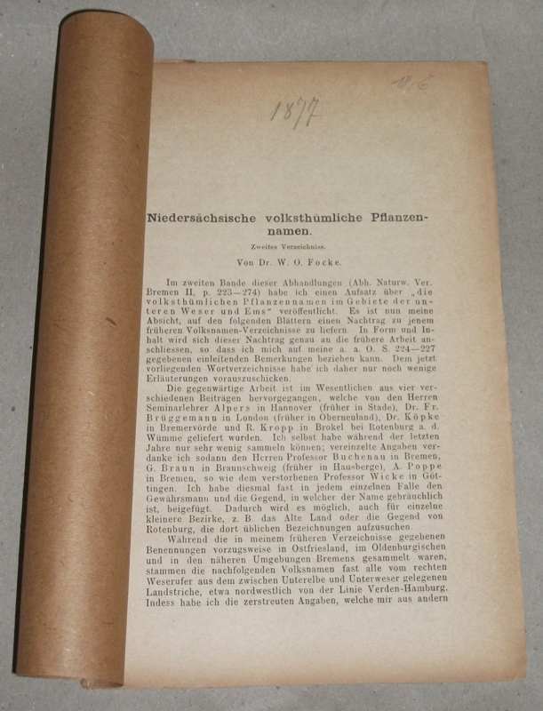 Focke, Dr. W. O.: Niedersächsische volksthümliche Pflanzennamen. Zweites Verzeichniss. Mit Anhang: Volksthümliche Pflanzennamen Westphalens. Sonderdruck. 23,5 cm, S. 413 – 450. Broschur. Kanten bestoßen, Name a. Umschlag, Papier vom Schnitt her gebräunt. Unbeschnitten. [Abh. Naturw. Ver. Bremen 1877]