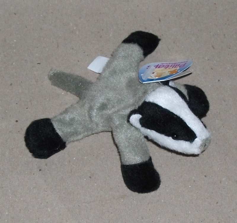 Magnettier Dachs. Plüsch, Länge ca. 10 cm. Mit 1 großen u. 4 kleinen Magneten. Neuware.