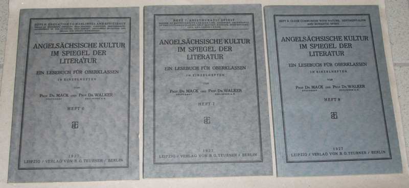 Mack, Albert; Walker, Theodor: Angelsächsische Kultur im Spiegel der Literatur Heft 6, 7 + 8. Ein Lesebuch für Oberklassen in Einzelheften. Heft 6: Education to Manliness and Efficiency. Ideals of efficiency, Tenacity, Self-Control, Fortitude, Responsibility, Government by the Governed, Self-Respect; Gentleman Education and Regard for strong Womanhood. Heft 7: Aristocratic Spirit. Esteem of Respectability and High Life, Snobbery, Ascendancy of the Gentlemen Classes: Self-Respect, Reserve, Conventionality and conservatism. Heft 8: Close Communion with Nature. Sentimentalism and Romantic Spirit. 3 Bände. Leipzig: B. G. Teubner, 1927. 23 cm, 48 / 53 / 58 S. Broschur. Ecken und Kanten etw. bestoßen, Schnitt gebräunt u. fleckig, etw. gebogen. Titelblatt von Heft 6 fleckig. Sonst gut erhalten.
