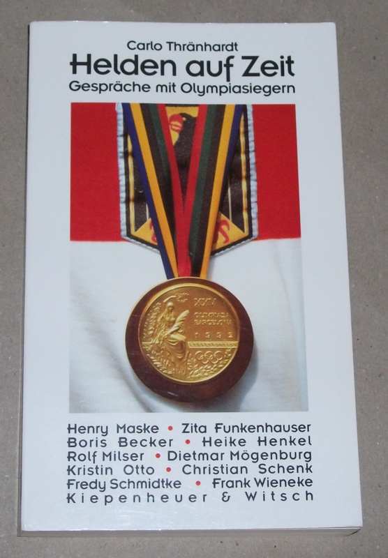 Thränhardt, Carlo; Stoffels, Irmgard [Red.]: Helden auf Zeit. Gespräche mit Olympiasiegern Henry Maske, Zita Funkenhauser, Boris Becker … Köln: Kiepenheuer und Witsch, 1994. 21 cm. 217 S., Ill. TB. Ecken etw. bestoßen, Einbandrückseite berieben. Sonst gut erhalten.