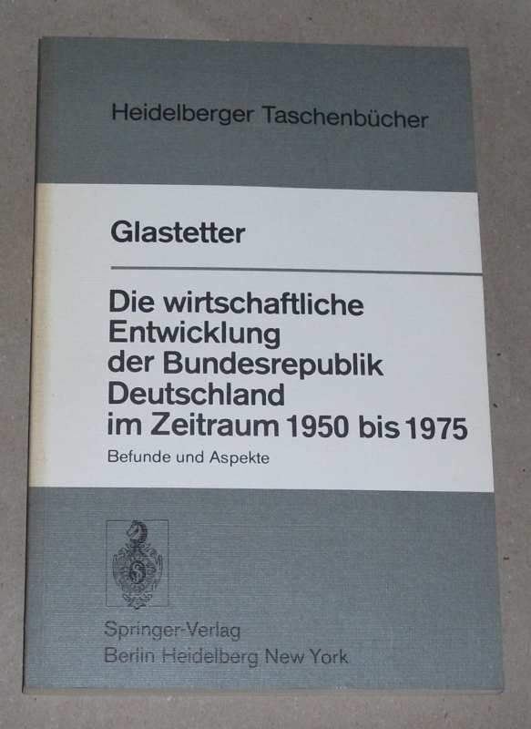 Glastetter, Werner: Die wirtschaftliche Entwicklung der Bundesrepublik Deutschland im Zeitraum 1950 [neunzehnhundertfünfzig] bis 1975 [neunzehnhundertfünfundsiebzig]. Befunde u. Aspekte. Berlin, Heidelberg, New York: Springer, 1977. 21 cm. VII, 261 S., 90 graph. Darst. TB. Rücken u. Schnitt gebräunt. Sonst leichte Gebrauchsspuren. Heidelberger Taschenbücher ; Bd. 185. Mit 90 Schaubildern u. 133 Tab.