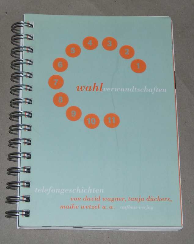 Wagner, David; Paulus, Jörg [Hrsg.]: Wahlverwandtschaften. Telefongeschichten von David Wagner, Tanja Dückers, Maike Wetzel u.a. 1. Aufl. Berlin: Aufbau-Verl., 2002. 20 cm. 181 S., Ill. Spiralgeheftet. Leichte Gebrauchsspuren.