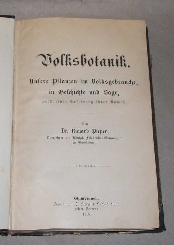 Pieper, Richard: Volksbotanik. Unsere Pflanzen im Volksgebrauche, in Geschichte und Sage, nebst eine Erklärung ihrer Namen. Gumbinen: Sterzel, 1897. 8°. 622 S., altdeutsche Schrift. HLdr. d. Zeit. Einband stark berieben, Rücken unten beschädigt (Fehlstelle, bestoßen), Einbandecken bestoßen / 1 mit Knickspur. Vorsätze etw. stockfleckig, Name a. V., vereinzelte Anstreichungen, Schnitt gebräunt. Sonst innen sauber und gut erhalten.