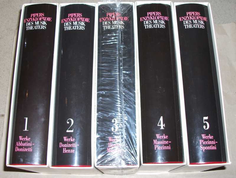 Pipers Enzyklopädie des Musiktheaters Bände 1-5 (von 7). Werke Abbatini – Spontini. (es fehlt Bd 6 Werke + der Registerband). 5 Bände. München: Piper, 1986. 26 cm, Rotes KstLdr., SU., im Schuber. Schuber etw. angeschmutzt, z.T. etw. bestoßen. Die Bücher leichte Gebrauchsspuren / Ungelesen. Literaturangaben