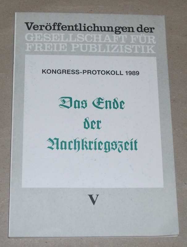 Das Ende der Nachkriegszeit. Kongress-Protokoll 1989. Berg: Vorstand d. GFP, 1990. 21 cm. 136 S. Kart. Einband etw. angeschmutzt, Block an der unteren Ecke etw. gebogen. Sonst gut erhalten. Kongress-Protokoll … / Gesellschaft für Freie Publizistik ; 1989 Veröffentlichungen der Gesellschaft für Freie Publizistik ; 5.