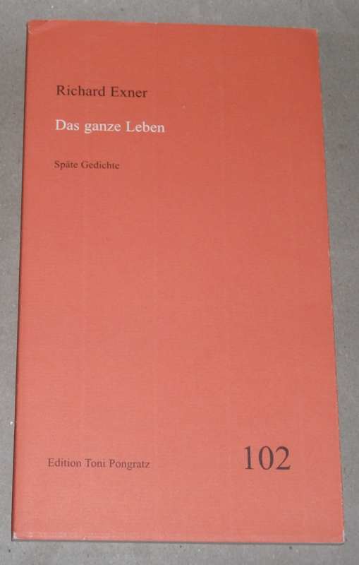 Exner, Richard: Das ganze Leben. Späte Gedichte. Hauzenberg: Ed. Pongratz, 2009. 21 cm. 59 S. Kart., SU. SU. mit leichteren Randläsuren. Leichte Gebrauchsspuren. Edition Toni Pongratz ; 102.