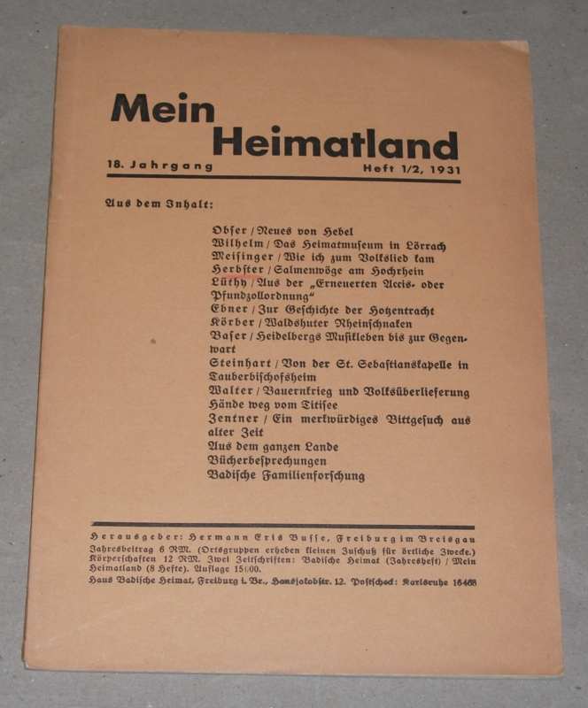 Mein Heimatland 18. Jahrgang Heft 1/2. Freiburg i. Br.: Badische Heimat 1931 25 cm, 64 S. mit Abb. Altdeutsche Schrift. Geheftet. Ecken bestoßen, Umschlag mit leichteren Randläsuren, am Rücken etw. beschädigt. Name a. T.