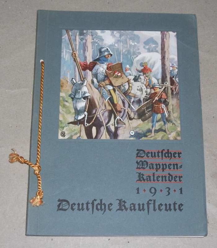 Deutscher Wappen-Kalender 1931: Deutsche Kaufleute. Fünfter Jahrgang. Bildlicher Schmuck v. Geschichtsmaler Gustav Adolf Cloß. Wortlaut und begleitende Erklärungen von Dr. jur. Bernhard Koerner. Görlitz: Verlag für Sippenforschung u. Wappenkunde C. A. Starke 21,5 cm, S. 166 – 206 mit Ill., altdeutsche Schrift. Kart. mit montiertem Deckelbild u. Kordelzug. Ecken / Einbandkante bestoßen. Sonst gut erhalten.