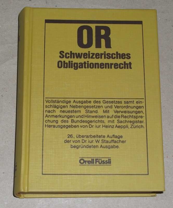 Aeppli, Heinz (Hrsg.): OR Schweizerisches Obligationenrecht. Vollständige Ausgabe des Gesetzes samt einschlägigen Nebengesetzen und Verordnungen nach neuestem Stand. Mit Verweisen, Anmerkungen und Hinweisen auf die Rechtsprechung des Bundesgerichts, mit Sachregister. 26, überarbeitete Aufl. Zürich: Orell Füssli (1985) 15 cm, 555 S., Ln., Schnitt gebräunt, Name a. V. Gut erhalten.