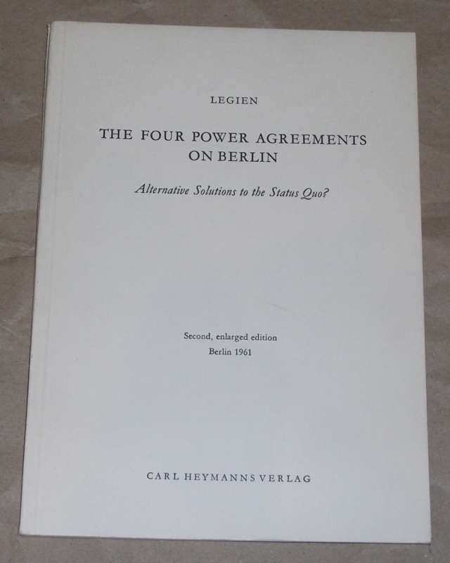 Legien: The four power Agreements on Berlin. Alternative Solutions to the Status Quo? Second, enlarged edition Berlin: Carl Heymann 1961 20,5 cm, 68 S., Broschur. Leichte Gebrauchsspuren.