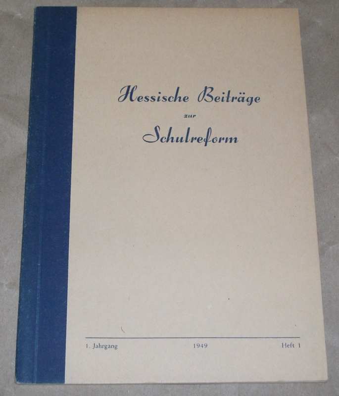 Hessische Beiträge zur Schulreform. Konvolut von 13 Heften. Enthält: 1. Jahrgang, 1. Reihe, Heft 1: Demokratie als Grundlage der Schulreform. Ein Beitrag zur hessischen Schulreform von der Education and Cultural Relations Division der Militärregierung in Hessen / 1. Jahrgang, 1. Reihe, Heft 2: Grundsätzliches zur DEmokratisierung des deutschen Bildungswesens. Ein Beitrag zur hessischen Schulreform von der Education and Cultural Relations Division der Militärregierung in Hessen / 1. Jahrgang, 3. Reihe, Heft 1: Dr. Otto Menne: Schülerauslese oder Erziehungsberatung? / 1. Jahrgang, 3. Reihe, Heft 3: Richtlinien und methodische Hinweise zu den Lehrplänen für das 5. Schuljahr aller Schulen im Lande Hessen. 1. Jahrgang, 3. Reihe, Heft 4: Arbeitsbericht des Auisschusses für Kunsterziehung / 1. Jahrgang, 3. Reihe, Heft 6: Bericht des Ausschusses für evangelische Religion / 2. Jahrgang, 3. Reihe, Heft 1: Martin Wagenschein: Der Aufbau des BIldes der Natur + Ida Maria Bauer: Der Aufbau des Bildes der Kultur aus denm Kulturwissen und den Sprachen. / 2. Jahrgang, 3. Reihe, Heft 11: Bericht des Ausschusses für Erziehungsberatung I. Teil: Beobachtungsbogen für den Lehrer. 2. Jahrgang, 3. Reihe, Heft 12: Bericht des Ausschusses für Erziehungsberatung II. Teil: Der Schülerbogen. Eltern und Erziehungsberatung (Der Elternbogen). / 2. Jahrgang, 3. Reihe, Heft 13: Bericht des Ausschusses für Leibeserziehung. / 2. Jahrgang, 3. Reihe, Heft 14: Bericht des Ausschusses für Kunsterziehung. 2. Aufl. / 2. Jahrgang, 3. Reihe, Heft 15: Bericht des Ausschusses für Mathematik. / 2. Jahrgang, 3. Reihe, Heft 19: Abschlussbericht des Deutschausschusses. 13 Bände. Wiesbaden: Gabler 1949 / 1950 21,5 cm, Broschur. Rücken an den Kapitalen z.T. etw. beschädigt, Umschläge gebräunt u. etw. berieben. Z.T. Ecken etw. bestoßen, 1 Heft mit Stewmpel a. Umschlag. Insgesamt gut erhalten.