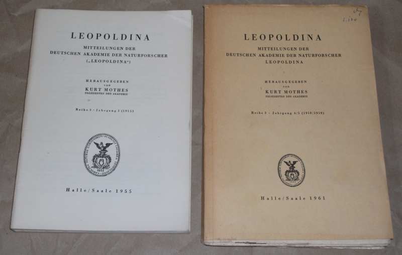 Mothes, Kurt (Hrsg.): Leopoldina. Reihe 3 Jahrgang 1 – 12 in 10 Bänden. Mitteilungen der Deutschen Akademie der Naturforscher. 10 Bände. Halle / Saale: 1955-1967 21 / 22,5 cm, mit Abb. Geheftet / Broschur. Umschlage gebräunt / angestaubt, z.T. Name a. Umschlag. 5 Bände unbeschnittene / unaufgeschnittene Interimsbroschüren. Gut erhalten.