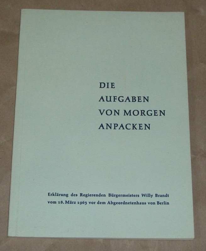Brandt, Willy: Die Aufgaben von morgen anpacken. Erklärung des Regierenden Bürgermeisters Willy Brandt vom 18. März 1963 vor dem Abgeordnetenhaus in Berlin. Berlin: Presse- und Informationsamt 1963 21 cm, 62 S. mit Abb. Broschur. Leichte Gebrauchsspuren.