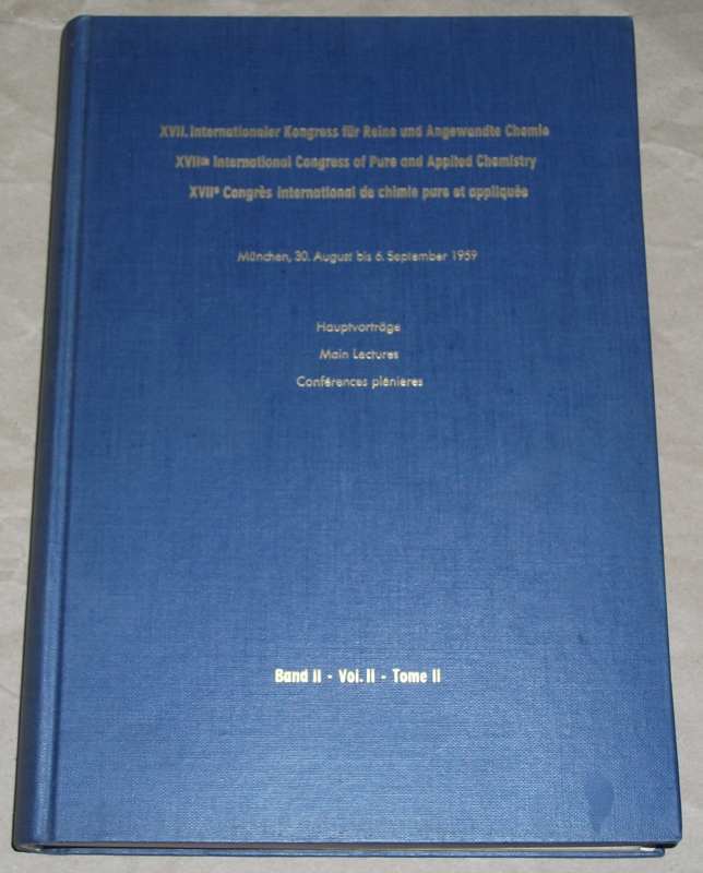 XVII. Internationaler Kongreß für Reine und Angewandte Chemie Band II. München 30. August bis 6. September 1959. Hauptvorträge. Band II: Biochemie und Angewandte Chemie. London / Weinheim /Bergstr.: Butterworth , Verlag Chemie 1960 24 cm, 426 S. mit Abb. , Texte z.T. englisch / französisch. Ln. Einband etw. fleckig, Schnitt gebräunt u. stockfleckig. Sonst gut erhalten.