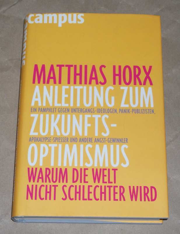 Horx, Matthias: Anleitung zum Zukunfts-Optimismus. Warum die Welt nicht schlechter wird; [ein Pamphlet gegen Untergangs-Ideologen, Panik-Publizisten, Apokalyse-Spiesser und andere Angst-Gewinnler]. 1. Aufl. Frankfurt/Main/New York: Campus-Verl., 2007. 215 mm x 140 mm. 310 S. graph. Darst. Ppd., SU. Leichte Gebrauchsspuren. Oberer Schnitt mit flacher Druckspur.
