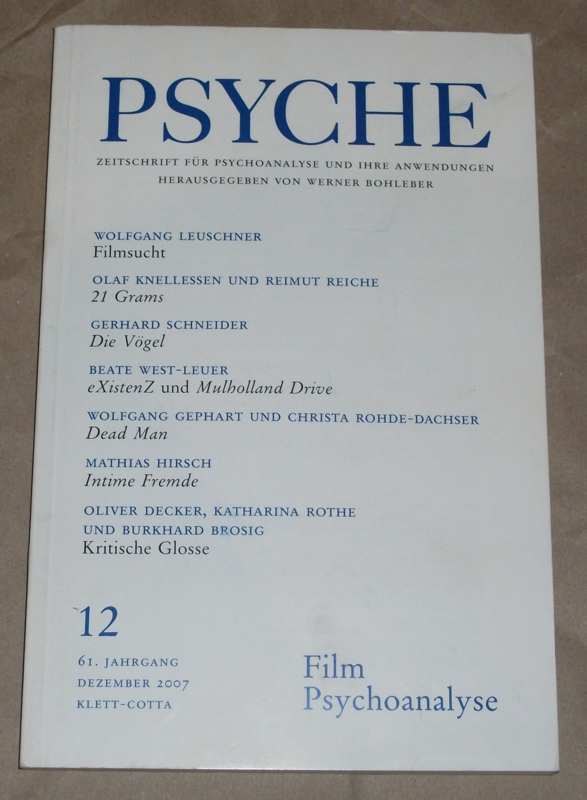 Bohleber, Werner (Hrsg.): Psyche Jahrgang 61, Heft 12: Film Psychoanalyse. Zeitschrift für Psychoanalyse und ihre Anwendungen. Stuttgart: Klett-Cotta 2007 23 cm, VII, S. 1189-1312 , Kart. Umschlag an den Kanten etw. bestoßen und leicht angeschmutzt. Gut erhalten.