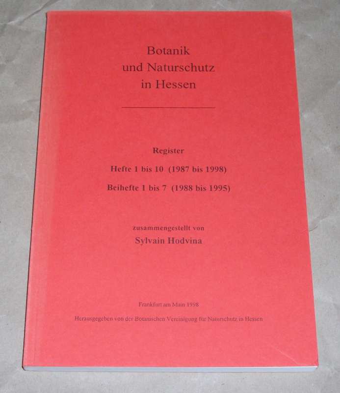 Hodvina, Sylvain: Botanik und Naturschutz in Hessen Beiheft 8. Register Hefte 1-10 (1987 bis 1998) Beihefte 1 bis 7 (1988 bis 1995). Frankfurt / M.: Botanische Vereinigung für Naturschutz in Hessen 1998 24 cm, 242 S., Kart. Rücken etw. verblichen, Umschlagecken etw. bestoßen. Sonst leichte Gebrauchsspuren.