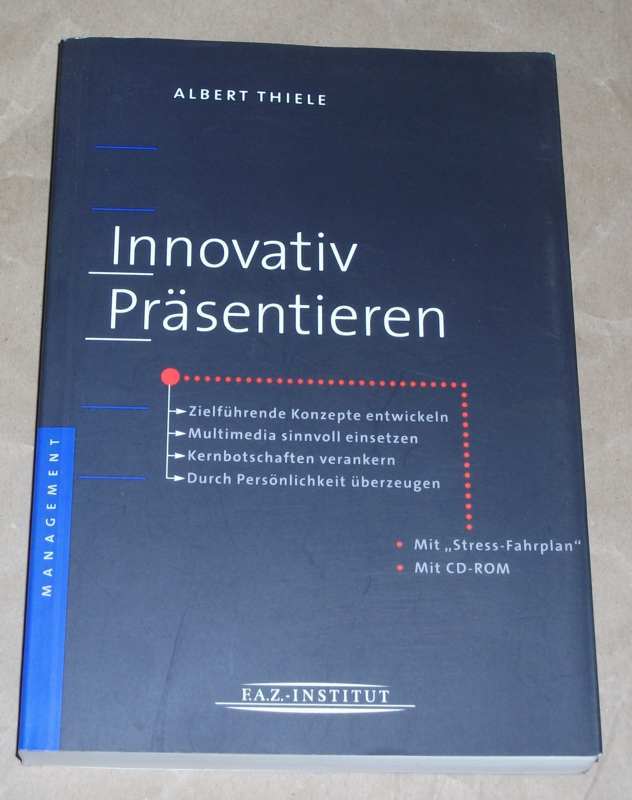 Thiele, Albert: Innovativ präsentieren. Zielführende Konzepte entwickeln; Multimedia sinnvoll einsetzen; Kernbotschaften verankern; durch Persönlichkeit überzeugen; mit „Stress-Fahrplan“ und CD-ROM. Frankfurt am Main: FAZ-Inst. für Management-, Markt und Medieninformationen, 2000. 21 cm, 342 S. graph. Darst. 1 CD-ROM. Klappenbroschur. Einband leicht berieben, Name a. V.