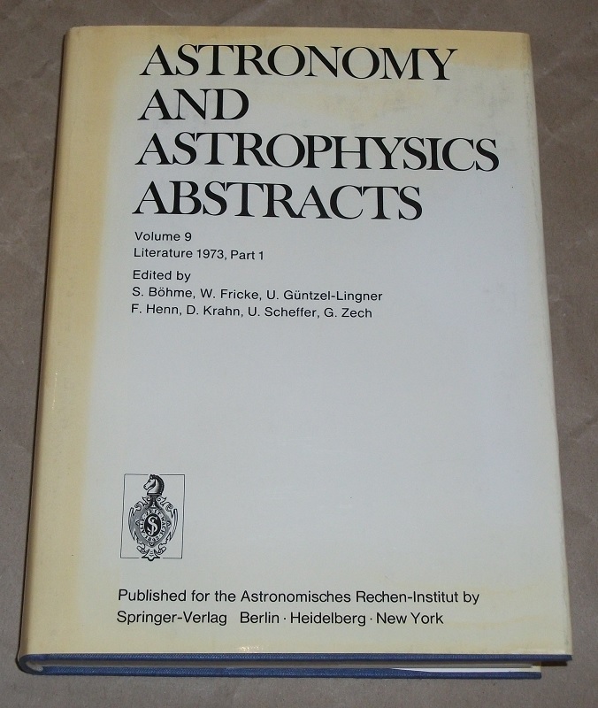 Böhme, S. (Hrsg.) u.a.: Astronomy and Astrophysics absracts. Volume 9. Literature 1973, Part 1. Berlin, Heidelberg, New York: Springer for the Astronomisches Rechen-Institut 1973 25 cm, X, 610 S., Ln., SU. SU. z.T. gebräunt u. etw. angeschmutzt. Schnitt etw. angeschmutzt. Sonst gut erhalten.