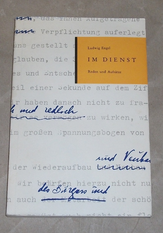 Engel, Ludwig: Im Dienst. Reden u. Aufsätze 1950 – 1956. Darmstadt: Justus v. Liebig Verl., 1958. 19,5 cm, 113 S. Engl. Brosch. Umschlag mit Fleck am Rücken / Rückseite, etw. eingerissen u. gebräunt. Schnitt etw. gebräunt. 1 S. mit Fleck im weißen Seitenrand. Darmstädter Schriften ; 7.