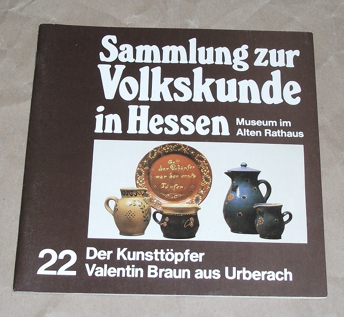 Grein, Gerd J.: Der Kunsttöpfer Valentin Braun aus Urberach. Otzberg-Lengfeld: Sammlung zur Volkskunde in Hessen, Museum im Alten Rathaus, c 1983. 20 cm. 35 S., zahlr. Ill. (z.T. farb.), 1 graph. Darst., Kt. Geheftet. Umschlagecke mit leichter Knickspur, am Rücken etw. berieben. Sonst leichte Gebrauchsspuren. Materialien zur Töpferei in Hessen ; 2 Sammlung zur Volkskunde in Hessen, Museum im Alten Rathaus ; 22.